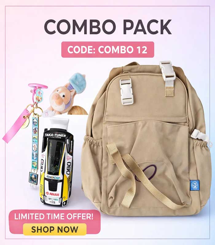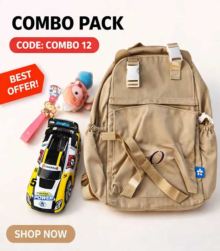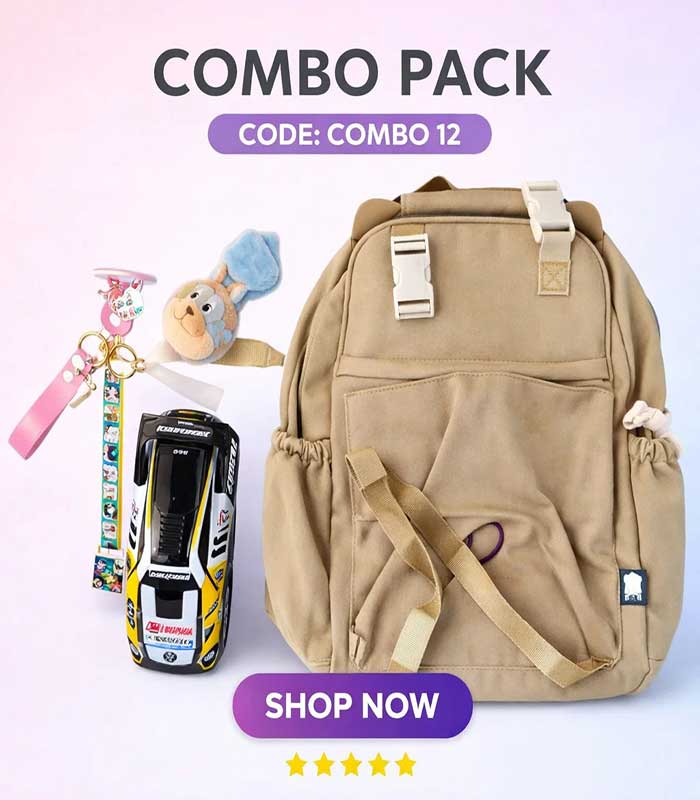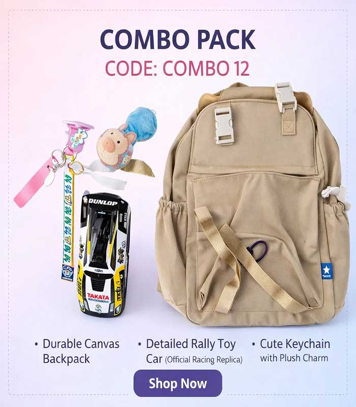 Fuel your child’s imagination and gear them up for school or play with Combo 12. This curated set features a heavy-duty, earth-toned canvas backpack paired with a high-speed die-cast pull-back racing car and a charming plush keychain. It is the perfect blend of practical utility and playful style for the modern, active kid.
