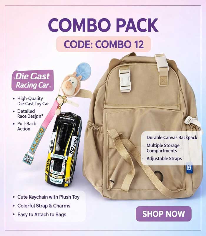 Be the first to review “Adventure-Ready Canvas Backpack with Die-Cast Racing Car & Plush Keychain – Combo 12”