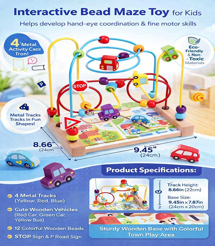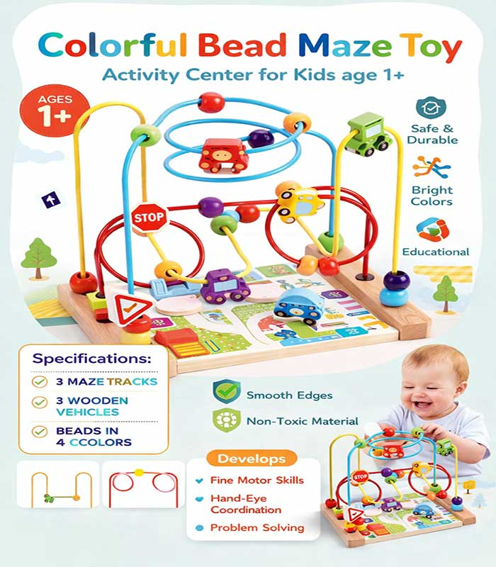 - Dual-Action Play: Functions as both a rolling pull-along toy and a stationary 3D bead maze for versatile entertainment.