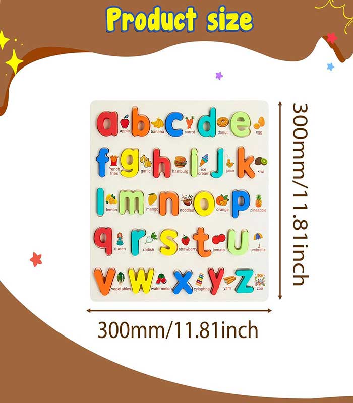 Each letter is vibrantly colored to capture a child’s attention and sits atop a corresponding illustration—from ‘a’ for apple to ‘z’ for zoo. This association helps develop phonetic awareness and expands their vocabulary through familiar foods, animals, and objects. The thick, chunky wooden pieces are easy for small fingers to grasp, promoting fine motor skills and hand-eye coordination as they match each letter to its correct slot. Whether used at home or in a classroom setting, this puzzle fosters a love for learning that lasts a lifetime.