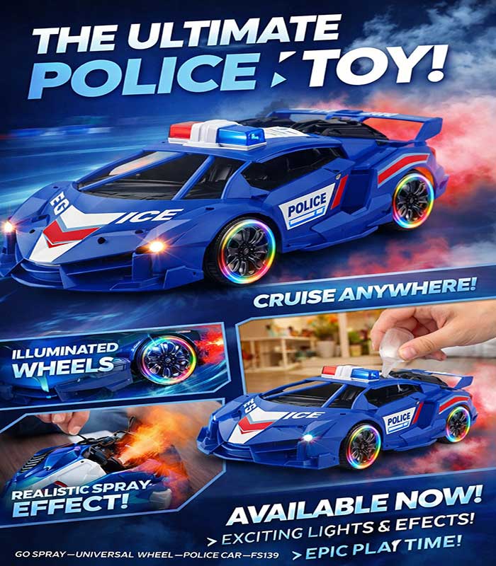 Transform any living room or driveway into a thrilling high-pursuit scene with the Go Spray FS139 Police Car. Designed for children who crave action and parents who value quality, this RC car stands out with its unique “Nitro-Spray” feature. By simply adding clean water to the internal reservoir, the car emits a safe, cool mist from the tailpipes, mimicking a real exhaust system—all enhanced by glowing red LEDs for a “fire” effect.