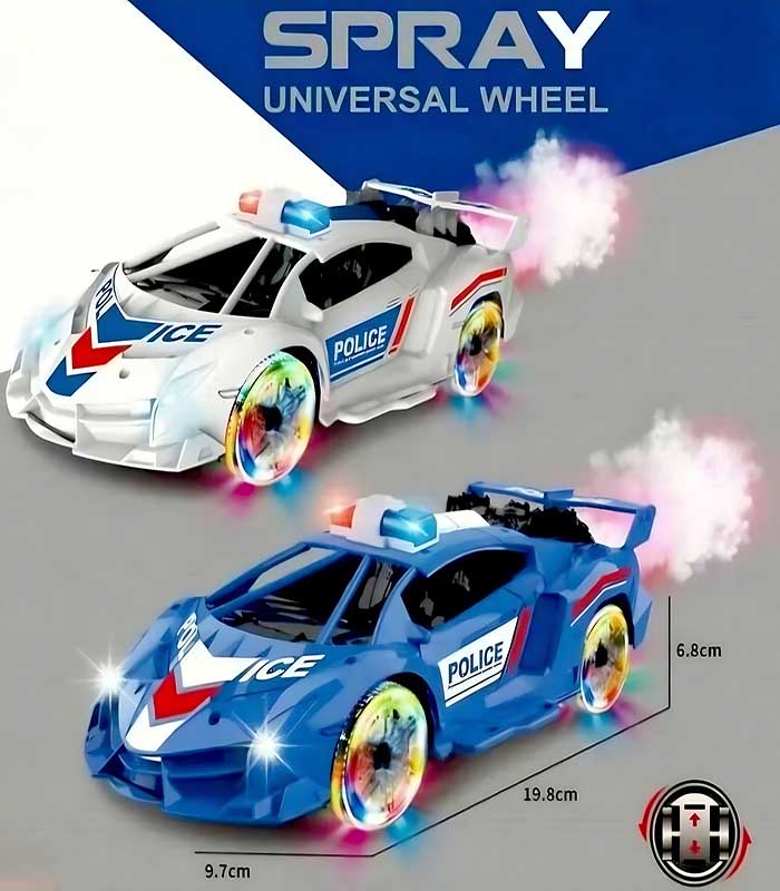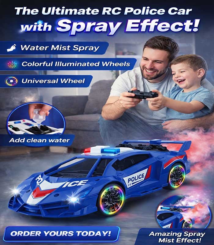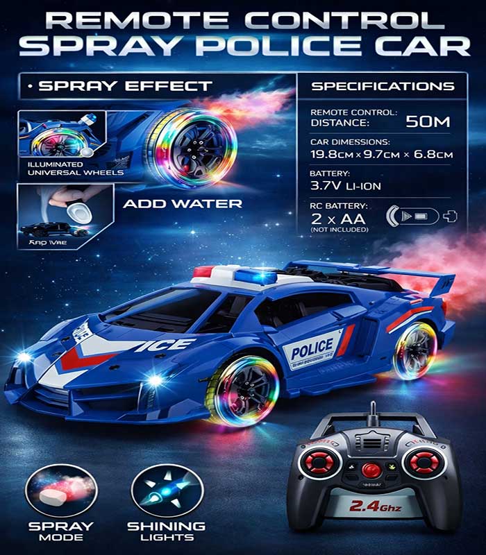 Ignite your child’s imagination with the Ultimate Remote-Control Spray Police Car. This high-performance toy isn’t just a vehicle; it’s an immersive experience featuring a realistic water mist exhaust, vibrant LED-illuminated wheels, and a sleek, aerodynamic design. Engineered with Universal Wheel technology and a 50-meter control range, it’s the perfect gift for little heroes who love high-speed chases and spectacular light shows.