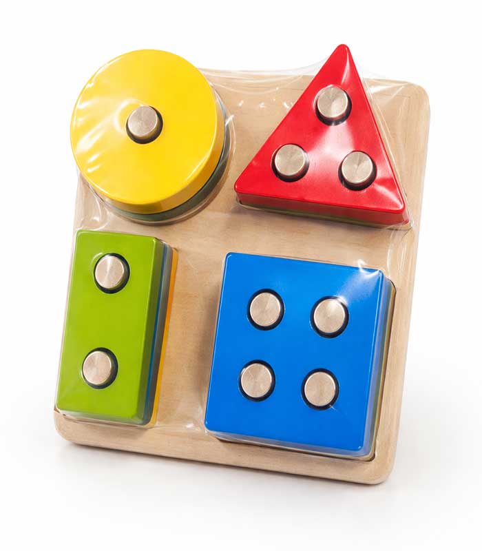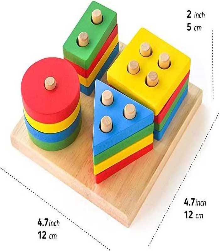 Children are naturally drawn to the smooth textures and bold primary colors. As they work to fit the 16 wooden pieces onto their designated columns, they develop critical spatial awareness and hand-eye coordination. The varying number of holes—ranging from one for the circle to four for the square—introduces foundational counting and math concepts in a fun, intuitive way.