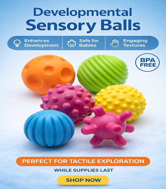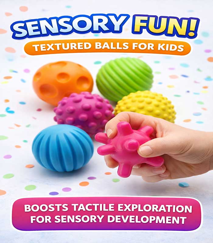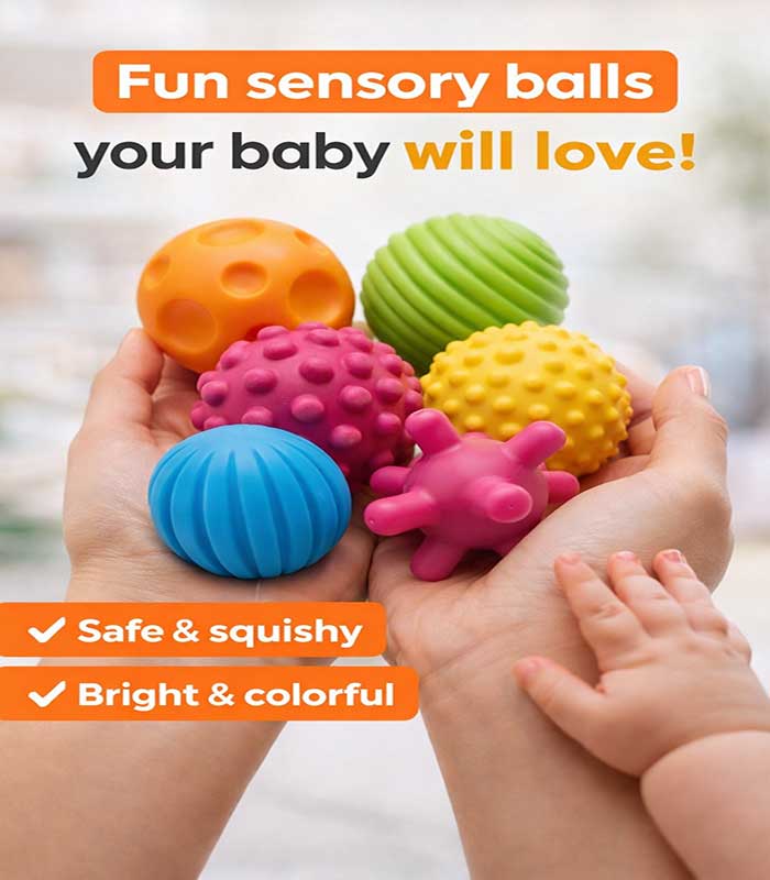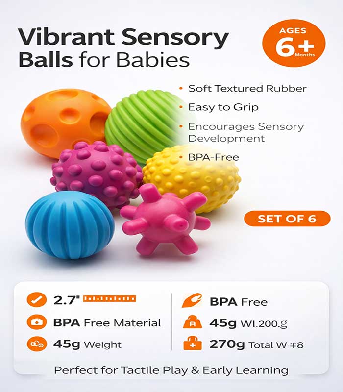 Ignite your little one’s curiosity with our Multi-Textured Sensory Ball Set. Designed specifically for tiny hands, these six vibrant, BPA-free balls feature unique shapes and textures to promote tactile exploration, sharpen motor skills, and provide endless hours of safe, squishy fun. It is the perfect foundational toy for babies aged 6 months and up to explore the world through touch and play.