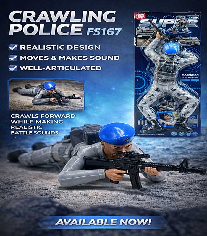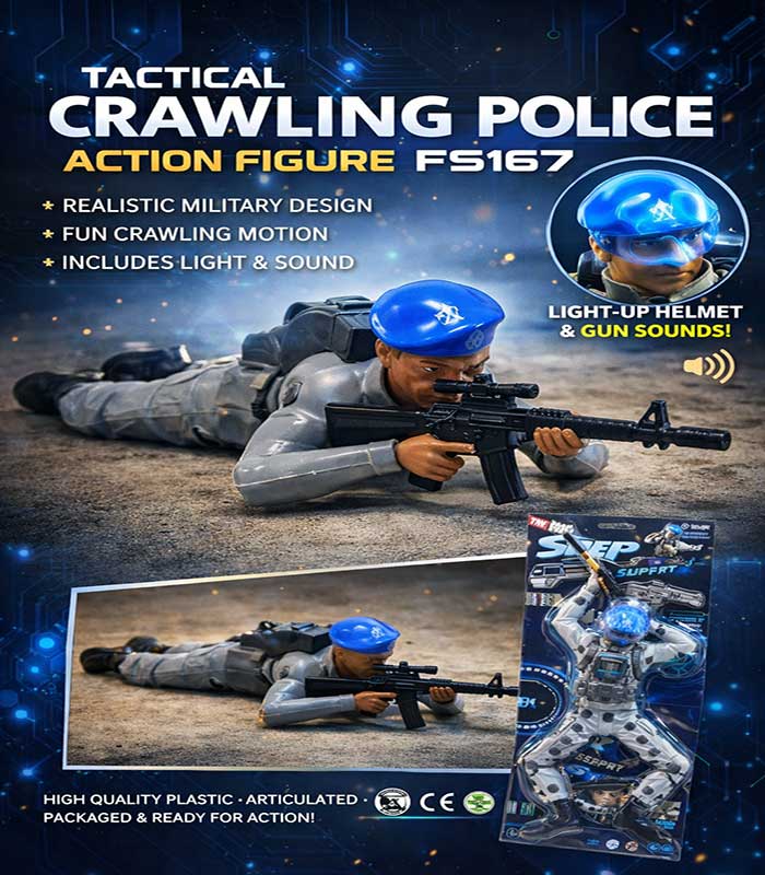 Ignite your child’s imagination with the Crawling Police Action Figure (FS167). This battery-operated tactical marksman brings the excitement of a high-stakes rescue mission to life, featuring realistic crawling mechanics, authentic battle sounds, and a glowing tactical helmet. Perfect for little heroes aged 3 and up, it’s a durable, high-energy toy designed for immersive floor-play adventures.